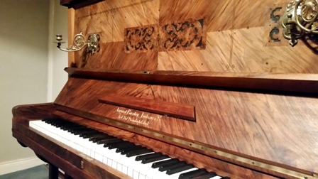 1895 original Grand Concert upright August Forster with tall Burr Walnut Veneered casing, ornate paneling, brass candle holders, and big, powerful rounded tone. A fine instrument by one of the world's most respected high ranking manufacturers. The internals are overhauled with a partially rebuilt action and component replacement throughout. We have worked on many August Forster's, but this one has by far the longest strings and biggest soundboard, projecting a broad resonant sound, with a deep potent bass register, right down to the last note, and with pure depth of tone in the mid and high range.